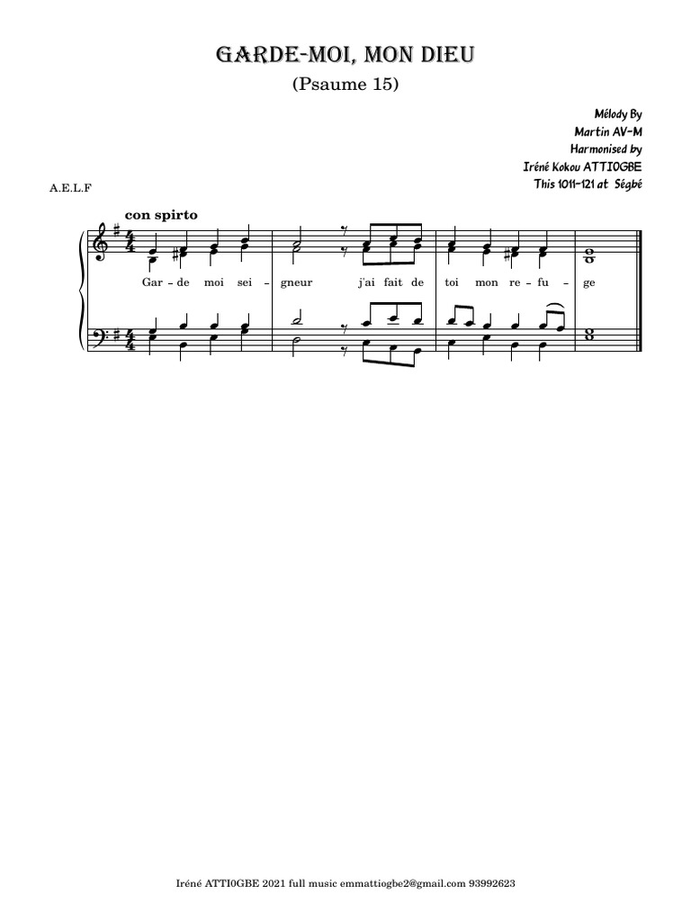 Ps15 Gardemoi mon Dieu Sheet music for Soprano, Alto, Tenor, Bass Partition Gratuite Garde-Moi Mon Seigneur J'ai fait de toi mon refuge, fa#7 sim la6 ré. J’ai dit au seigneur : « tu es mon dieu, sol la fa#. J'ai dit au seigneur : Près de lui je ne peux chanceler. mim mim7 la ré. Partition Gratuite Garde-Moi Mon Seigneur.